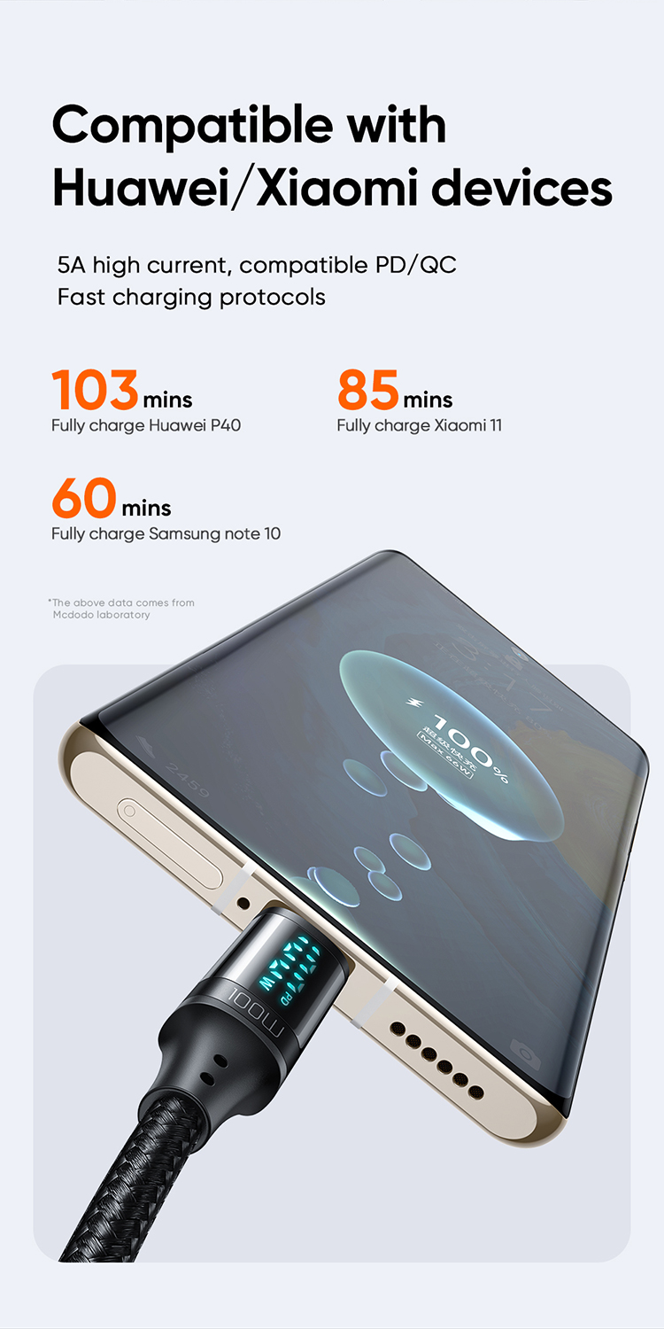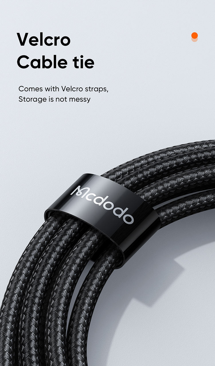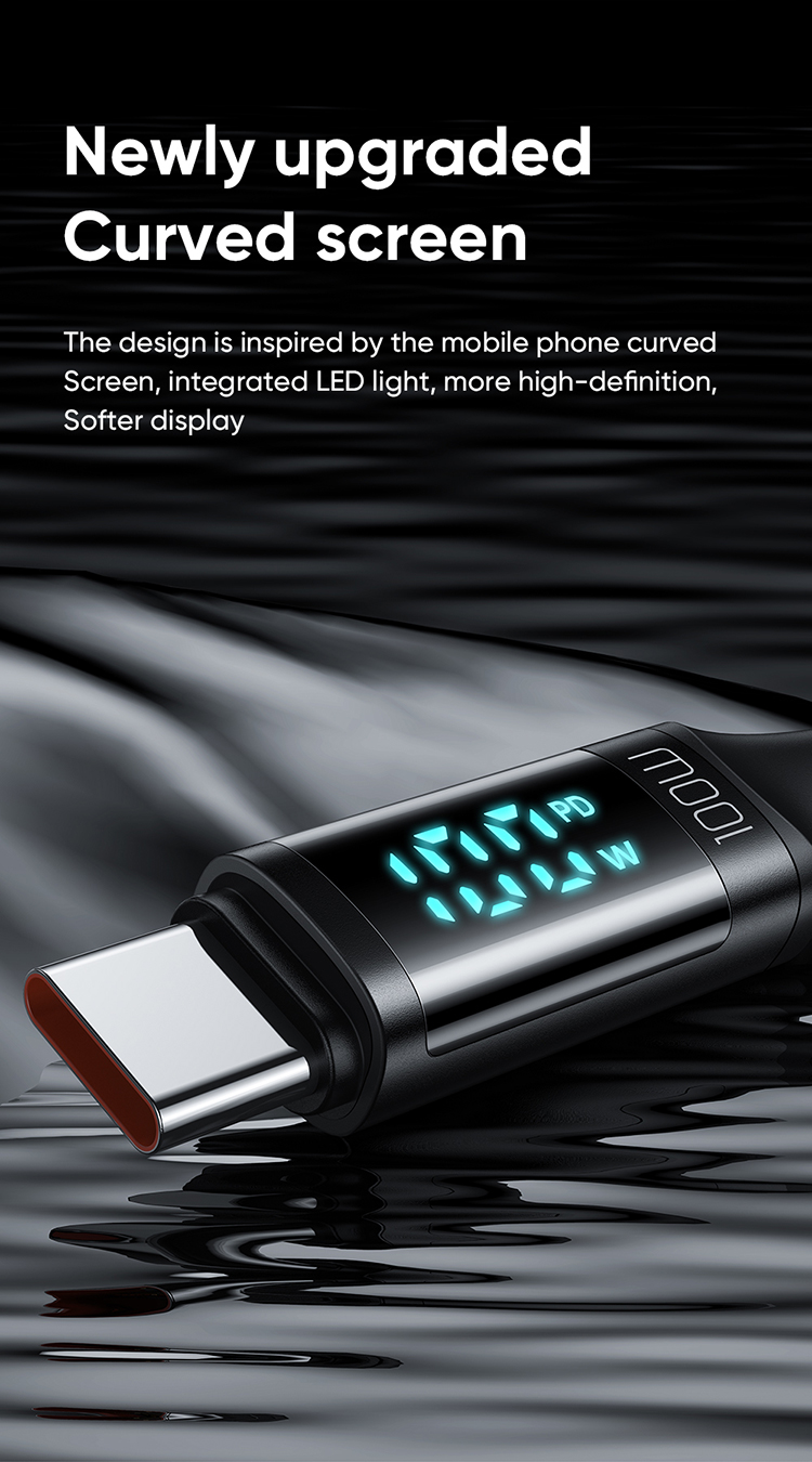بدنهی کابل از نایلون بافتهشده مقاوم و سوکتهایی از آلیاژ آلومینیوم ساخته شده که در برابر خمشدن، کشش و سایش مقاومت بالایی دارد. طول کابل 1.2 متر است و با طراحی ارگونومیک و نوار چسبی نظمدهنده، استفادهی روزمره را راحتتر میکند. این کابل همچنین دارای نمایشگر دیجیتال برای نمایش وضعیت شارژ است که تجربهای هوشمند و کاربردی را ارائه میدهد.