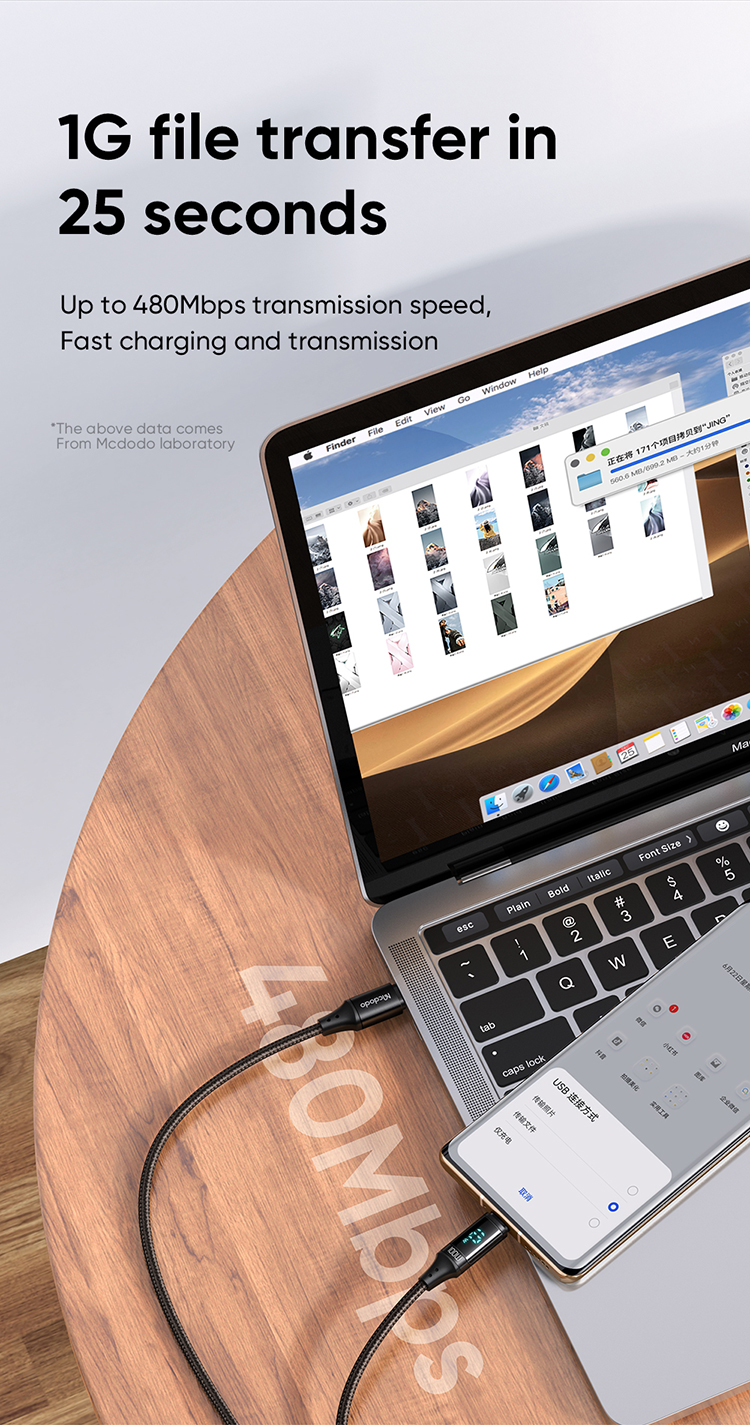 سرعت انتقال دادهی کابل تا 480Mbps میرسد و تراشهی هوشمند داخلی آن با تنظیم خودکار ولتاژ و جریان، از دستگاه در برابر نوسانات برق، اتصال کوتاه و افزایش دما محافظت میکند. انعطافپذیری بالا و تحمل بیش از 30,000 بار خمشدن نیز نشاندهندهی دوام فوقالعادهی این کابل است.