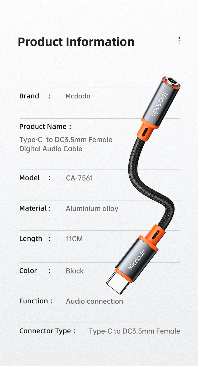 با تبدیل تایپ سی به جک 3.5 میلیمتری مک دودو مدل Mcdodo CA-7561، موسیقی را با کیفیت تجربه کنید! این محصول با طراحی مقاوم و سازگاری بالا، به شما امکان اتصال هدفونهای محبوبتان را به دستگاههای تایپ سی میدهد. با مک دودو، هرگز از موسیقی دلخواهتان جدا نشوید. خرید کنید و از کیفیت لذت ببرید!