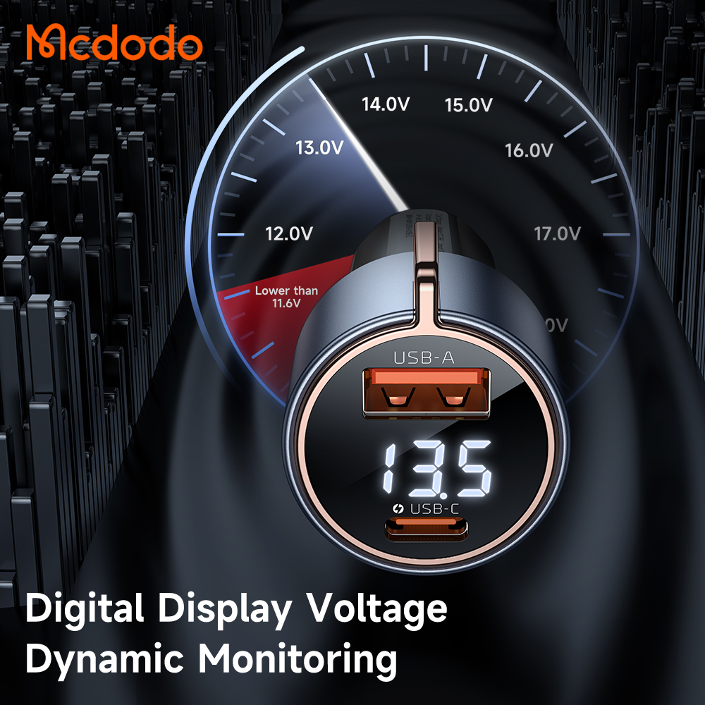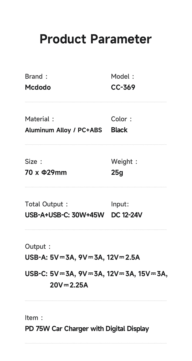 شارژر فندکى 75وات مک دودو مدل CC-3690 ساخته شده از آلیاژ آلومینیم و مواد PC+ABS علاوه بر ظاهر شکیل دارای استحکام مناسبی میباشد.این فندکی دارای دو خروجی USB و تایپ سی با توان خروجی مجموع 75 وات است که سهم تایپ سی 45 وات و USB توان 30 وات را پشتیبانی میکند.این فندکی از پروتکل های شارژ سریع PD3.0/ PPS/ QC4+/ QC3.0/ AFC/ FCP/ SCP/ SFC2.0/ BC1.2/Samsung/Apple 2.4A انواع موبایل و تبلت (بسته به قابلیت دستگاه و کابل مورد استفاده) پشتیبانی می نماید.این شارژر فندکی دارای نمایشگر ولتاژ میباشد که سهولت کار در تاریکی خودرو را نیز فراهم میکند.از شارژر فندکى 75وات مک دودو در انواع خودرو سواری و کامیون و اتوبوس می توان استفاده نمود.ساپورت ولتاژ ورودی DC 12V-24V از ویژگی های این فندکی است.