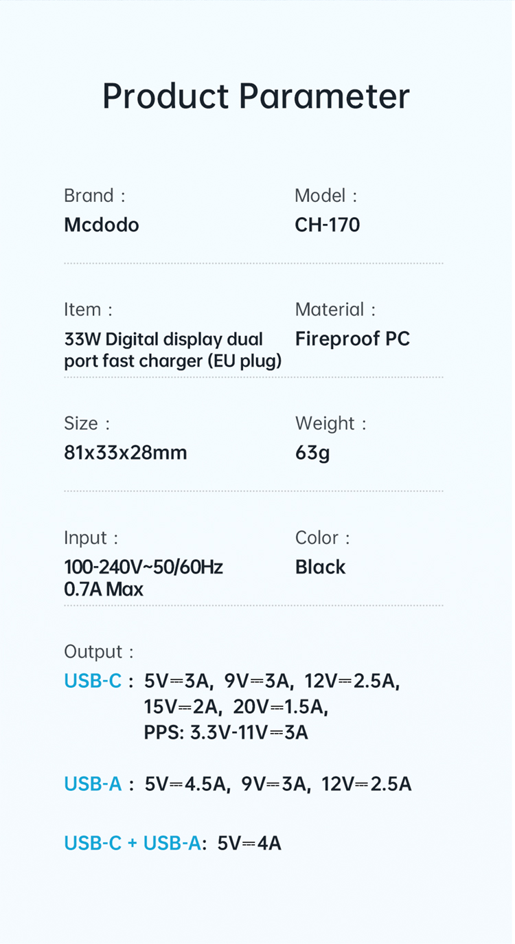 USB-A: 5V⎓4A, 9V⎓3A, 12V⎓2.5A, 30W