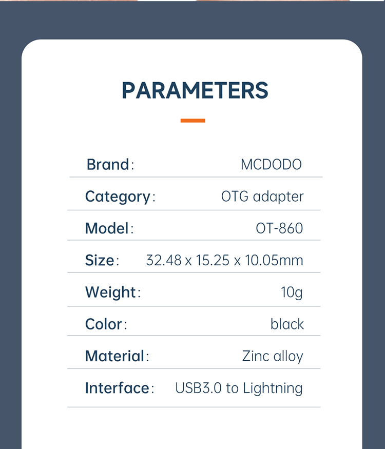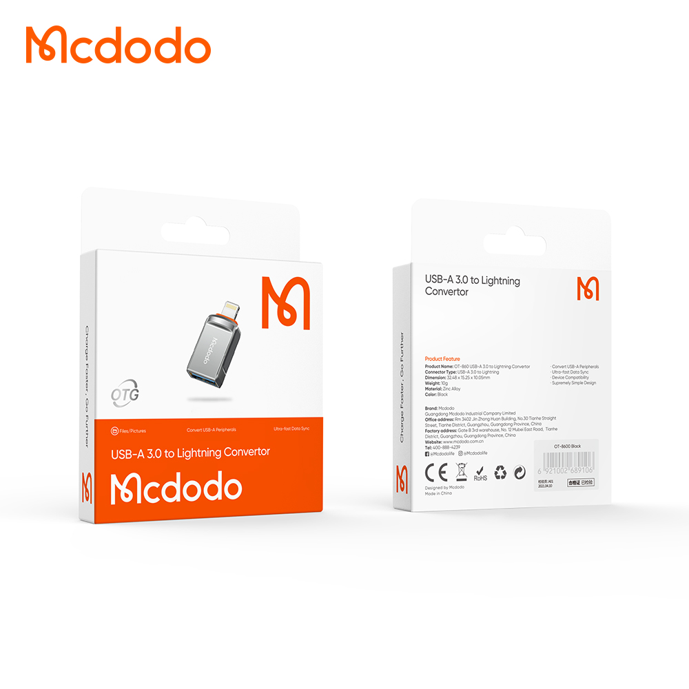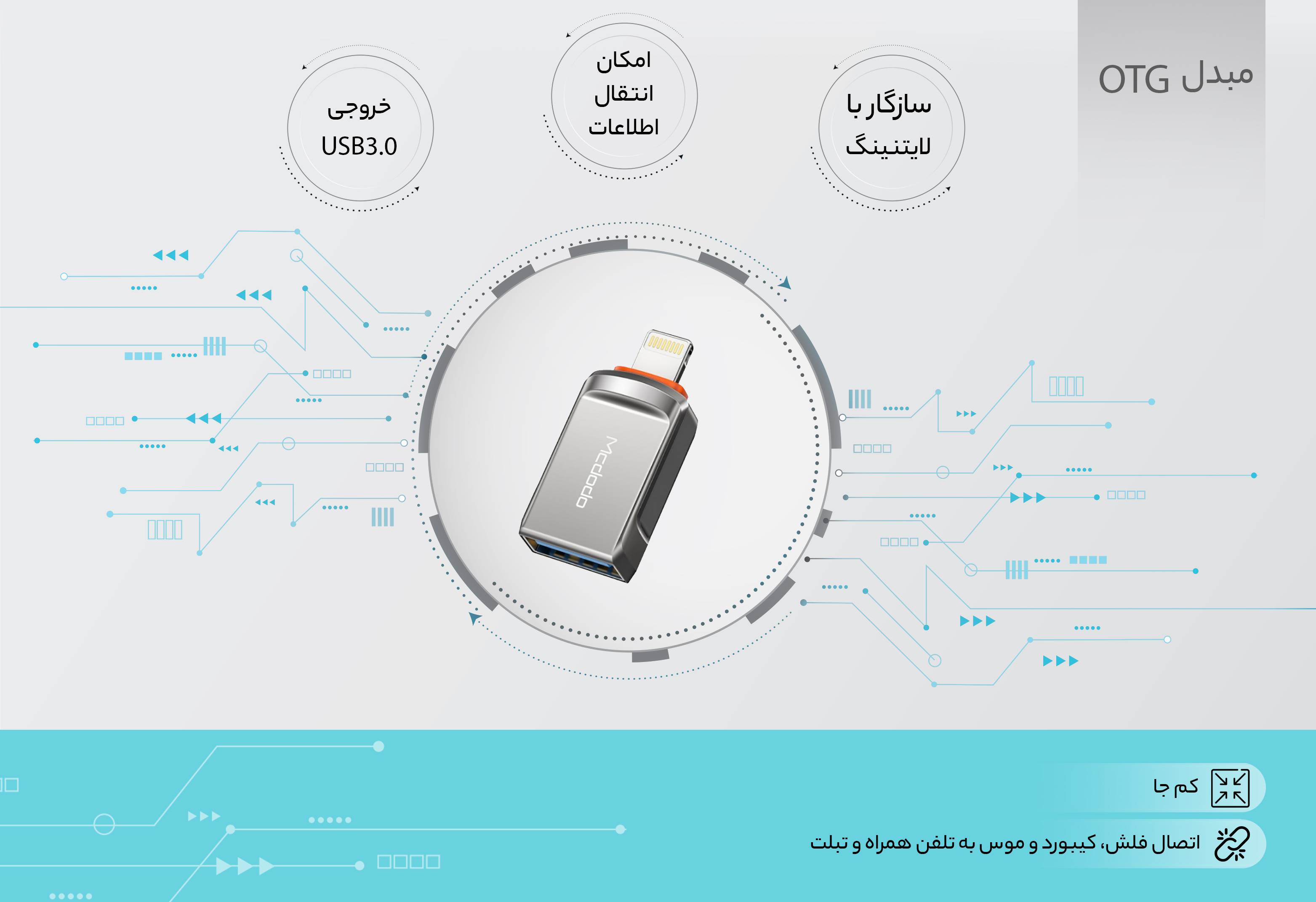 تبدیل USB به لایتنینگ قطعهای است که به شما امکان اتصال یک فلش یا رم ریدر با پورت USB به دستگاهی با پورت لایتنینگ را خواهد داد. این تبدیل معمولاً برای اتصال دستگاههایی مانند آیفون و آیپد که از پورت لایتنینگ برخوردار هستند به حافظههایی که فقط پورت USB دارند مورد استفاده قرار میگیرد. کمپانی مک دودو تبدیل USB به لایتنینگ مدل OT-8600 را به بازار ایران عرضه کرده است. استفاده از تبدیل USB به لایتنینگ بسیار راحت است. کافیست یک سر تبدیل را به طرفی که پورت USB دارد و سر دیگر را به طرفی که پورت لایتنینگ دارد وصل کنید. سپس میتوانید حافظه خود را با استفاده از کابل USB به لایتنینگ به دستگاه مقصد متصل کنید و از انتقال اطلاعات بین دو دستگاه لذت ببرید.