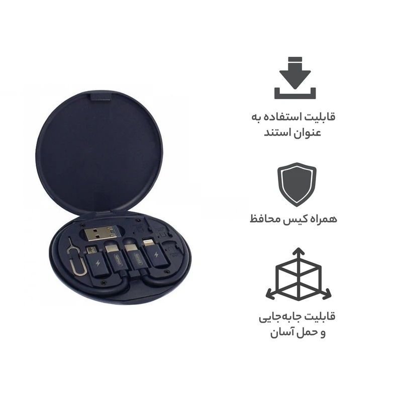 کیت چندمنظوره ریمکس مدل RC-190 یک راهحل همهکاره برای شارژ و انتقال اطلاعات است. شامل یک کابل USB-C به USB-C با طول ۲۹ سانتیمتر و سه مبدل مجزا (لایتنینگ، میکرو USB و USB-A) میباشد. با پشتیبانی از شارژ سریع ۶۰ وات و انتقال اطلاعات ۴۸۰ مگابایت بر ثانیه، تمام نیازهای شارژ شما را در سفر و خانه پوشش میدهد. باکس هوشمند آن علاوه بر نگهداری مبدلها، به پایه نگهدارنده گوشی تبدیل میشود و جایگاهی برای سیمکارت و کارت حافظه دارد.